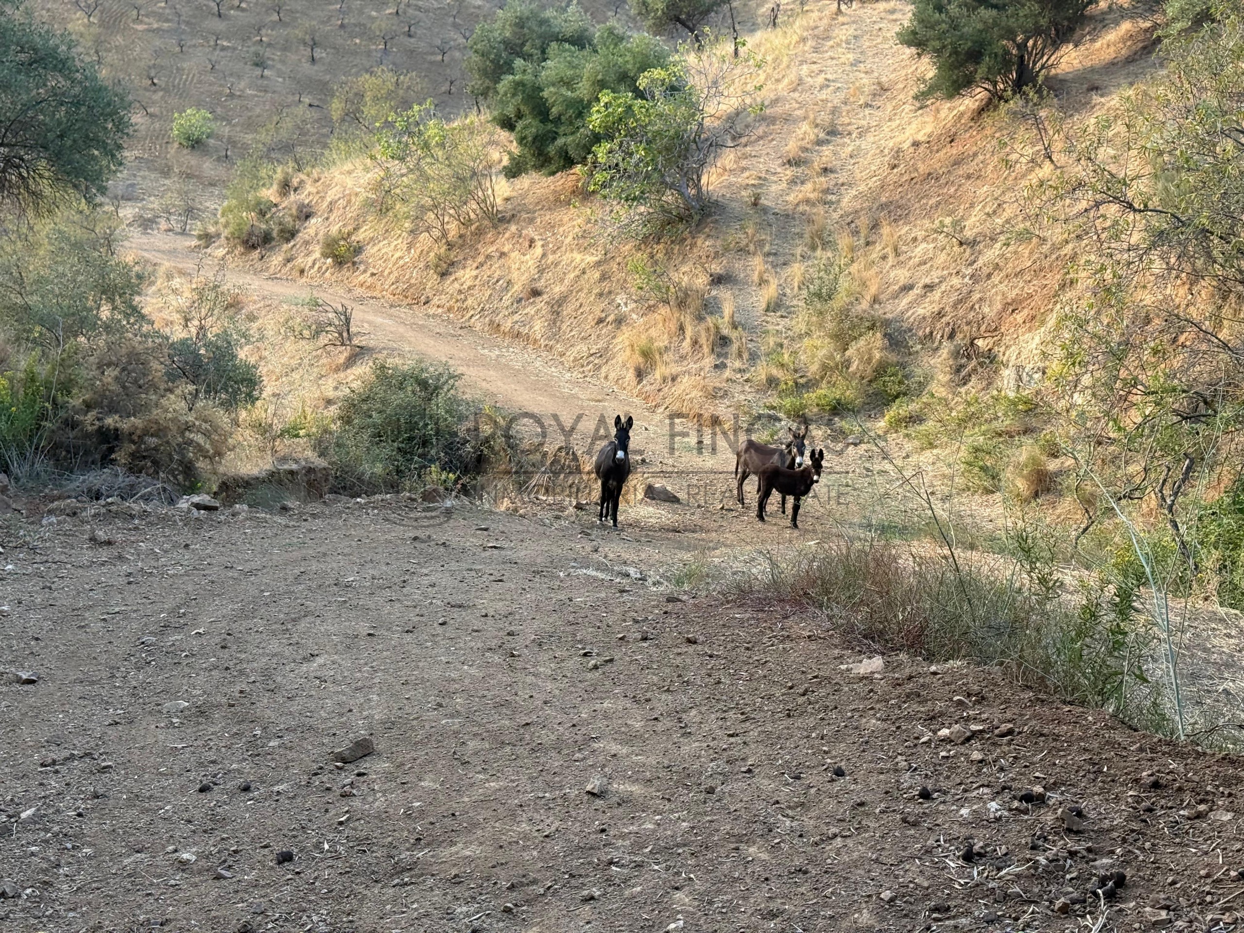 El terreno está poblado de almendros, olivos, encinas y algunos pinos, creando un entorno rural típico del interior malagueño.