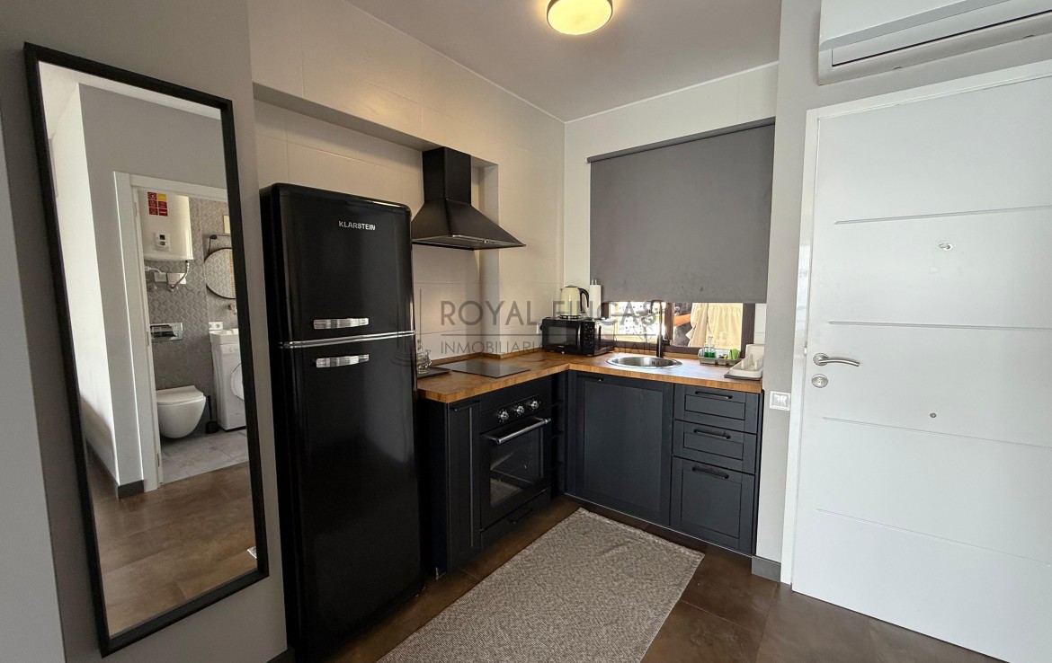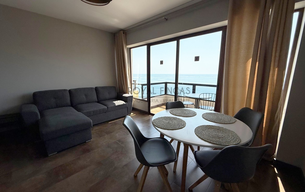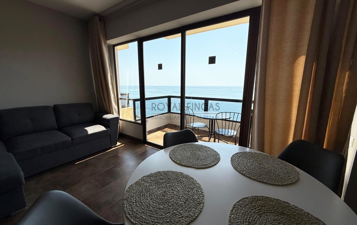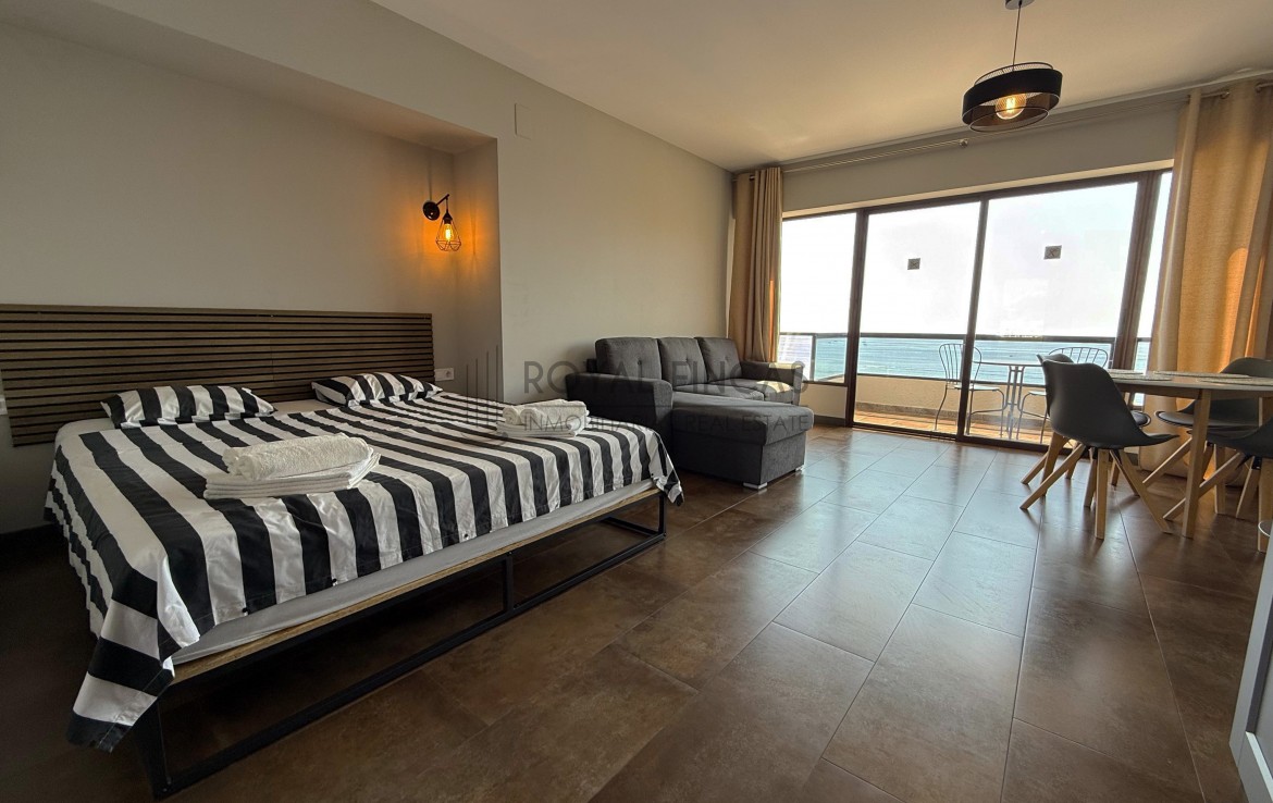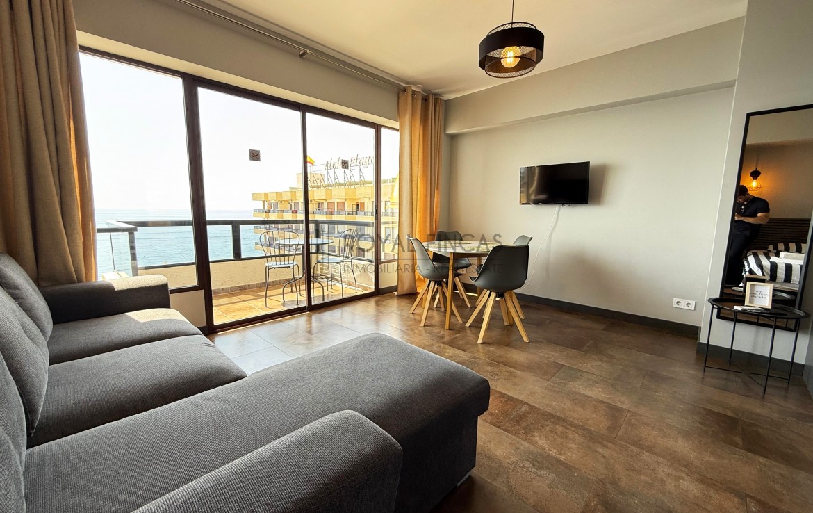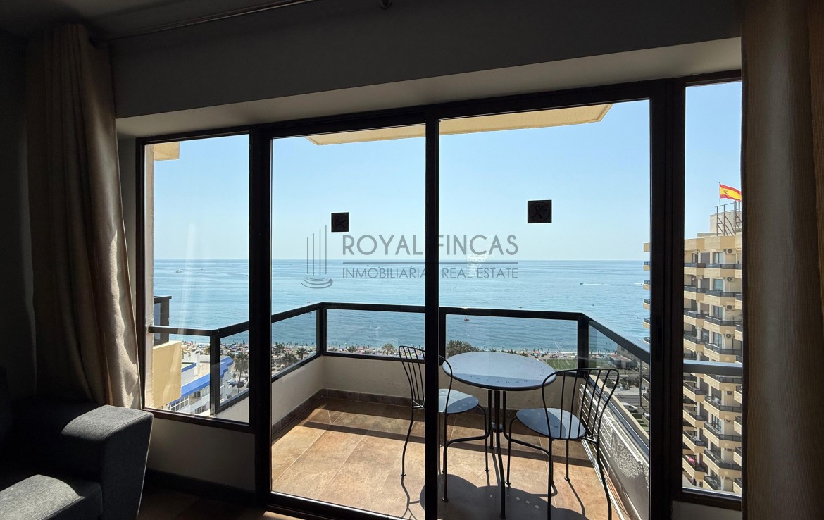 Se vende apartamento de 40 m² situado en la última planta del complejo Aloha Playa, en primera línea de playa. Tiene una cocina americana, baño, terraza privada con vistas abiertas al mar y a la ciudad, y aire acondicionado. Todo reformado recientemente, con acabados de calidad, muebles nuevos y electrodomésticos incluidos.